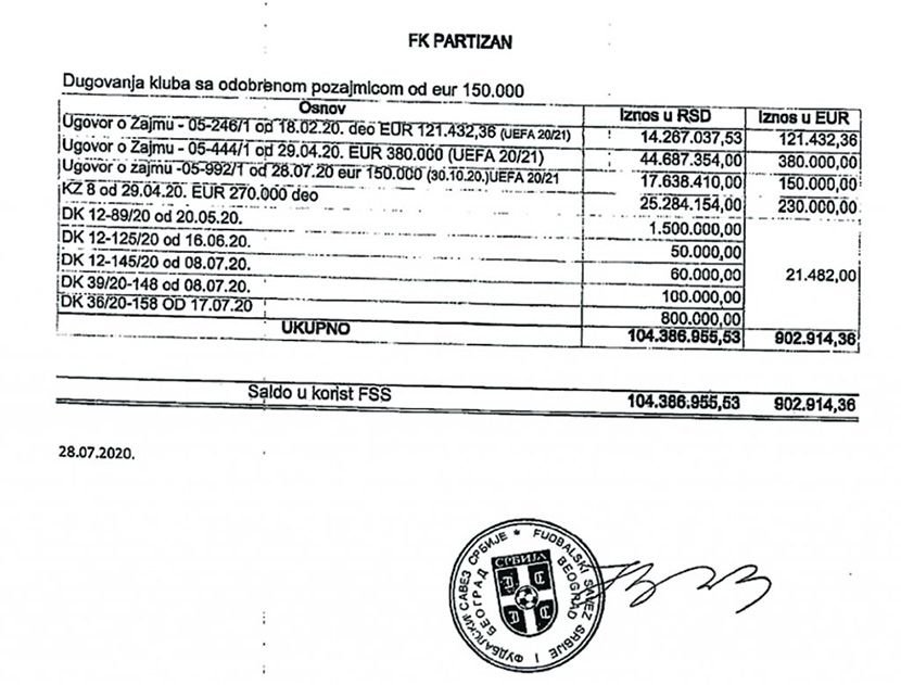 FSS OBJAVIO DOKUMENT O POZAJMICAMA PARTIZANU: Koliko klub iz Humske duguje Savezu (FOTO)