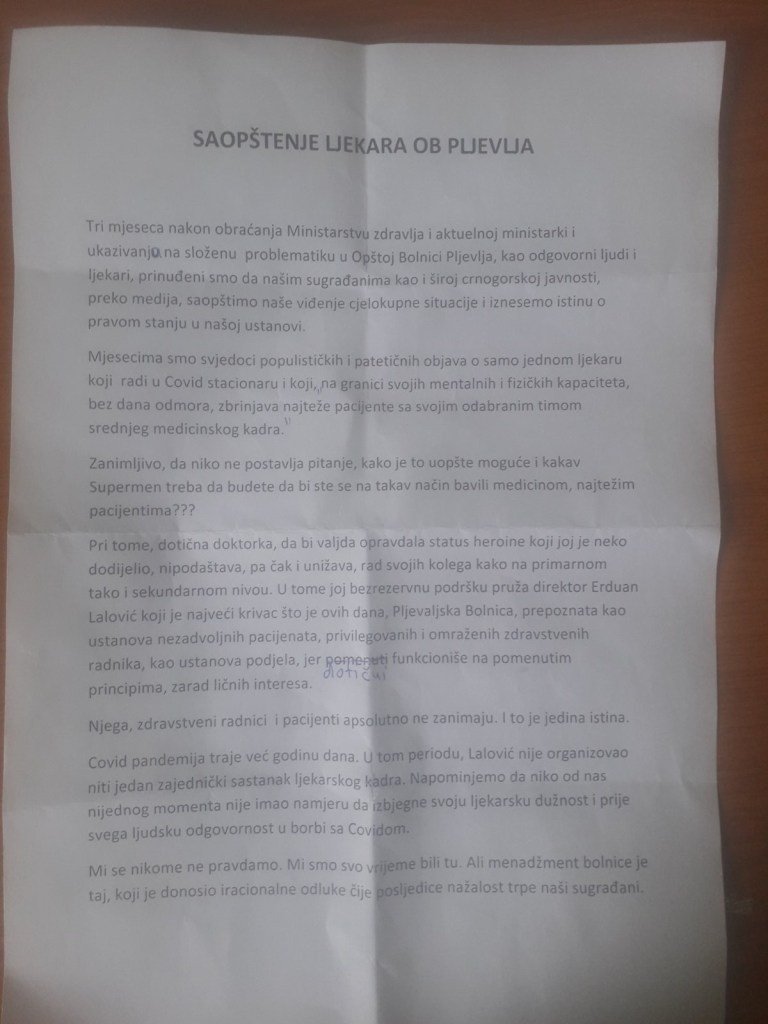 STANjE JE KATASTROFALNO, TRPE PACIJENTI: Otvoreno pismo lekara Opšte bolnice Pljevlja ministarki zdravlja (FOTO)