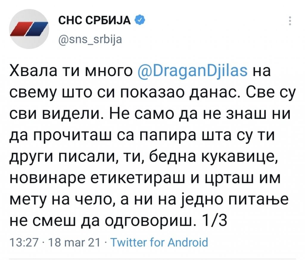 MALOVIĆ PORUČILA ĐILASU: Novinare etiketiraš i crtaš im metu na čelo!