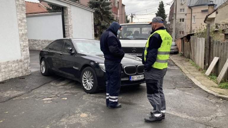 Parking-servis od jutros pokušava da podigne automobil marke BMV koji je bio u Miljkovićevom dvorištu, ali je vozilo blindirano, teško preko pet tona, što im otežava posao. Njima je u pomoć stigla još jedna dizalica oko 12.30 časova.