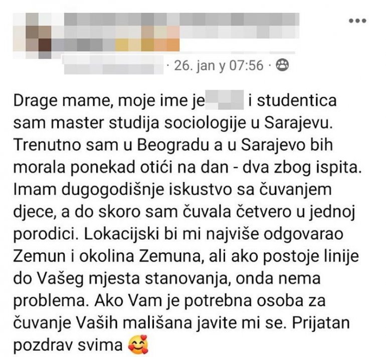 - Drage mame, moje ime je Azra i studentkinja sam master studija sociologije u Sarajevu. Trenutno sam u Beogradu, a u Sarajevo bih morala ponekad otići na dan-dva zbog ispita. Imam dugogodišnje iskustvo sa čuvanjem dece, a doskoro sam čuvala četvoro u jednoj porodici. Lokacijski bi mi najviše odgovarao Zemun i okolina Zemuna, ali ako postoje linije do Vašeg mjesta stanovanja, onda nema problema. Ako Vam je potrebna osoba za čuvanje Vaših mališana javite mi se. Prijatan pozdrav svima - napisala je.
