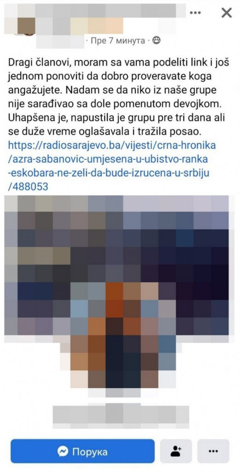 DVADESETDVOGODIŠNjA Azra Š. koja je uhapšena po poternici u Sarajevu zbog sumnje da je bila saučesnik u ubistvu Ranka Radoševića (54) Eskobara u Rušnju, dugo je na jednoj Fejsbuk grupi za čuvanje dece tražila posao, a odmah nakon hapšenja oglasio se administrator grupe sa upozorenjem o devojci.