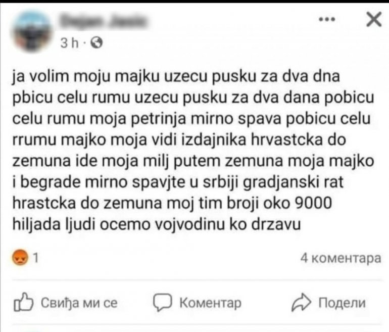 - Ja volim moju majku, uzeću pušku za dva dana, pobiću celu Rumu, moja Petrinja mirno spava, pomiću celu Rumu, majko moja vidi izdajnika, Hrvatska do Zemuna ide moja putem Zemuna, moja majko i Beograde mirno spavajte u Srbiji građanski rat, Hrvatska do Zemuna, moj tim broji oko 9.000 ljudi. Oćemo Vojvodinu kao državu - piše u poruci uhapšenog.