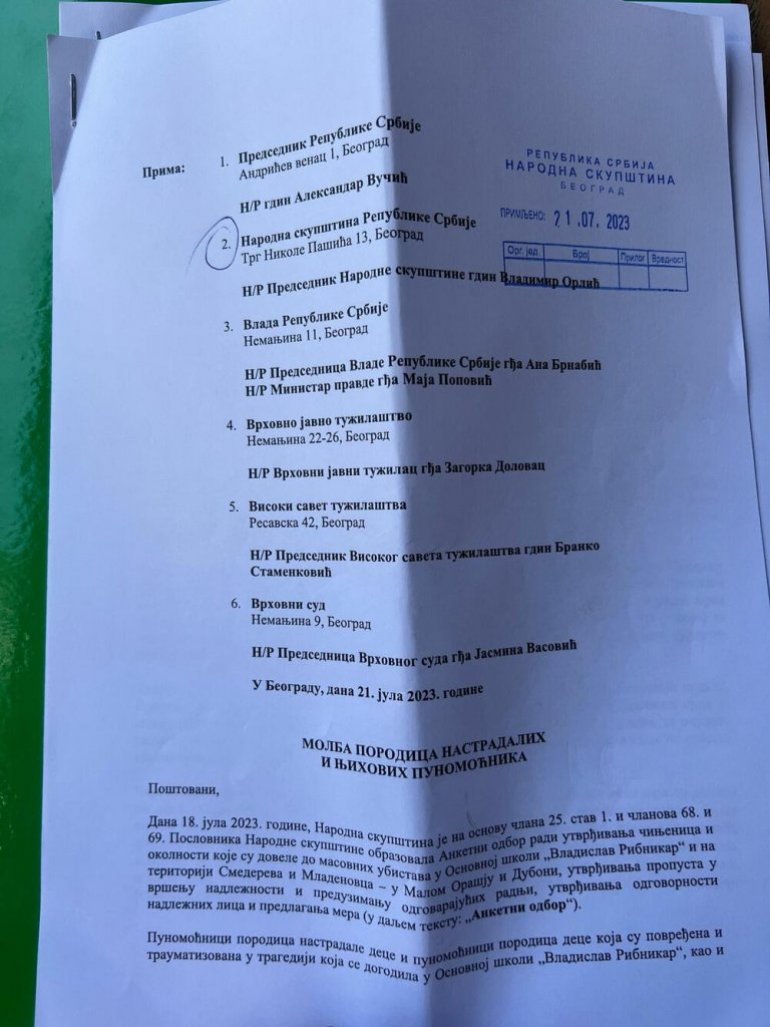 - Dostavljam Vam dokaz da smo predali u pisanom obliku molbu da se, u interesu istrage, odmah zastane sa bilo kakvim postupanjem i aktivnostima Anketnog odbora Skupštine osnovanog povodom nedavnih masovnih ubistava u Osnovnoj školi "Vladislav Ribnikar" u Beogradu i na teritoriji Mladenovca i Smedereva - kaže se u saopštenju.