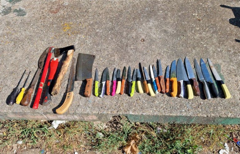 Policija je pretragom terena pronašla 20 komada hladnog oružja i drugih predmeta, ukupno 240 stranih ličnih dokumenata i putnih isprava, kao i 18 telefona.
