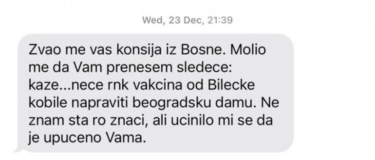 - Zvao me vaš komšija iz Bosne. Molio me da vam prenesem sledeće: Kaže... neće RNK vakcina od bilećke kobile napraviti beogradsku damu. Ne znam šta to znači, ali učinilo mi se da je to upućeno vama - navodi se u poruci koju je Simonović poslao ministarki 23. decembra.
