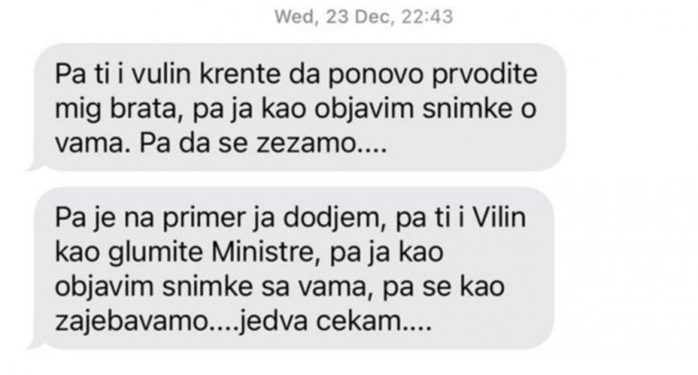 - Pa ti i Vulin krenete da ponovo privodite mog brata, pa ja kao objavim snimke o vama. Pa da se zezamo... Pa na primer ja dođem, pa ti i Vulin kao glumite ministre, pa ja kao objavim snimke sa vama, pa se kao za*ebavamo... jedva čekam...