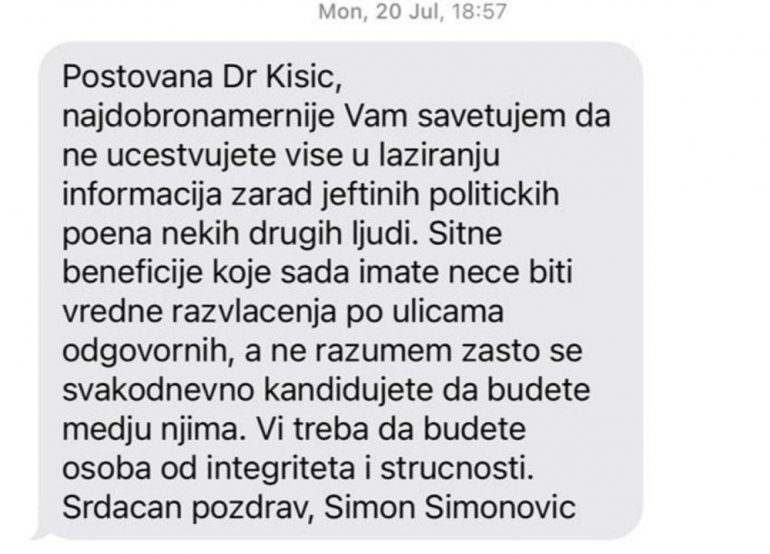 - Poštovana dr Kisić, najdobronamernije vam savetujem da ne učestvujete više u lažiranju informacija zarad jeftinih političkih poena nekih drugih ljudi. Sitne beneficije koje sada imate neće biti vredne razvlačenja po ulicama odgovornih, a ne razumem zašto se svakodnevno kandidujete da budete među njima. Vi treba da budete osoba od integriteta i stručnosti. Srdačan pozdrav, Simon Simonović - navodi se u poruci.