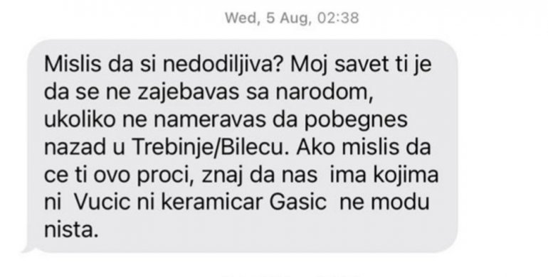 - Misliš da si nedodirljiva? Moj savet ti je da se ne zaje*avaš sa narodom, ukoliko ne nameravaš da pobegneš nazad u Trebinje/Bileću. Ako misliš da će ti ovo proći, znaj da nas ima kojima ni Vučić, ni keramičar Gašić ne mogu ništa - napisao joj je Simonović u ovoj poruci.