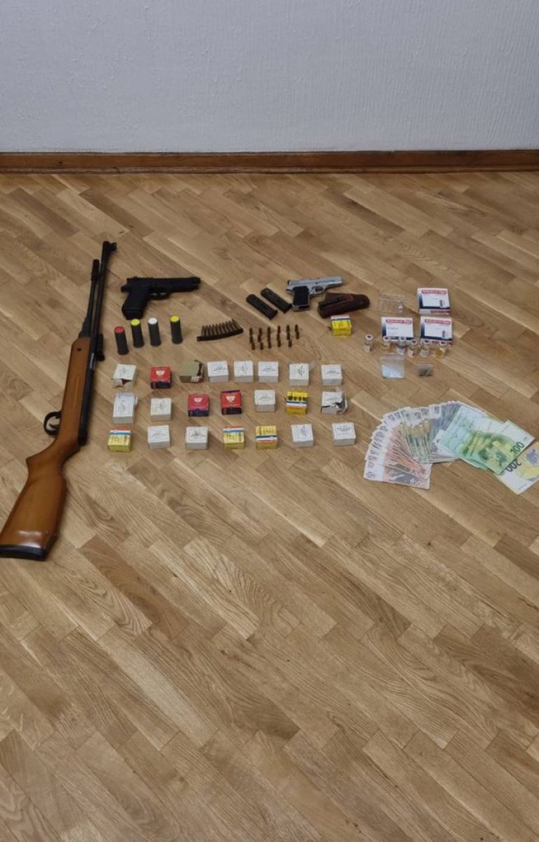Pretresom stanova osumnjičenih zaplenjeni su dva pištolja, vazdušna puška, oko 600 metaka, manja količina narkotika, kao i više mobilnih telefona, kompjuteri i novac.