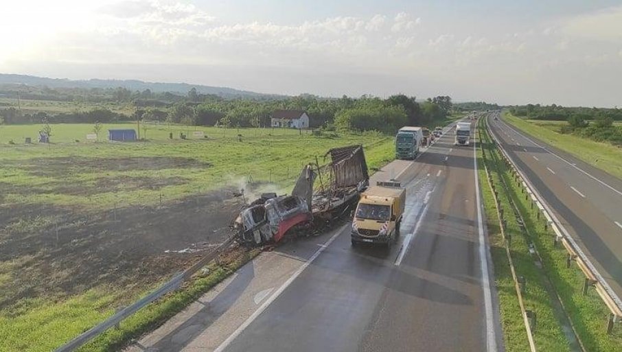 Nakon što su se dva kamiona sudarila jedan je potpuno izgoreo, a kako su mediji javili, lakše su povređena dva vozača.