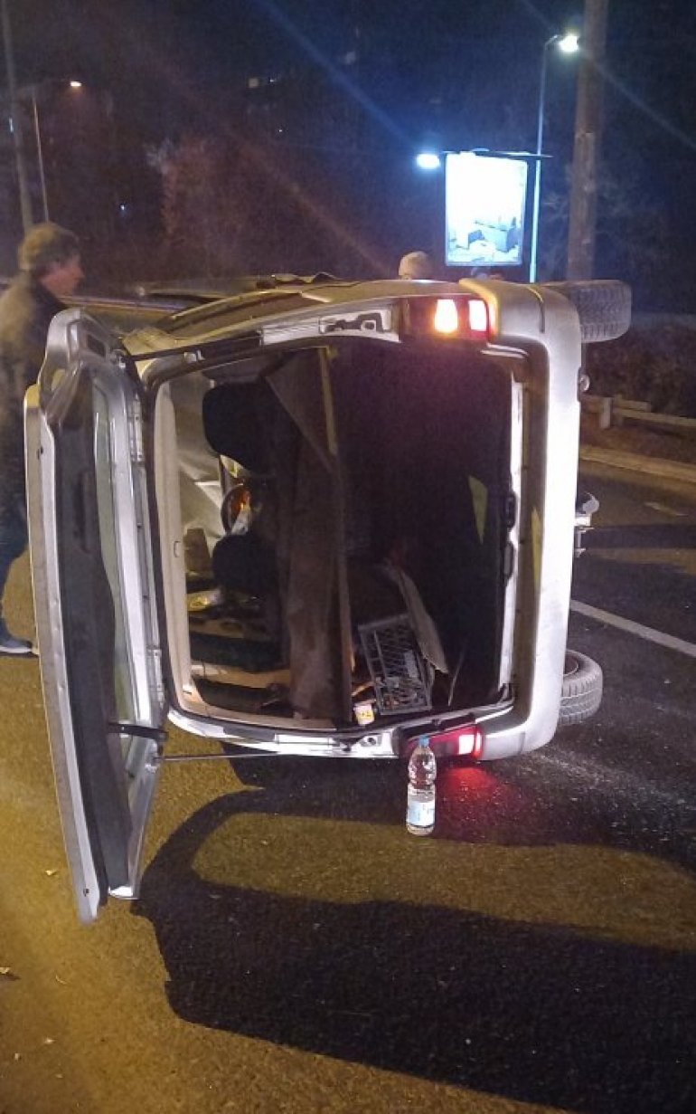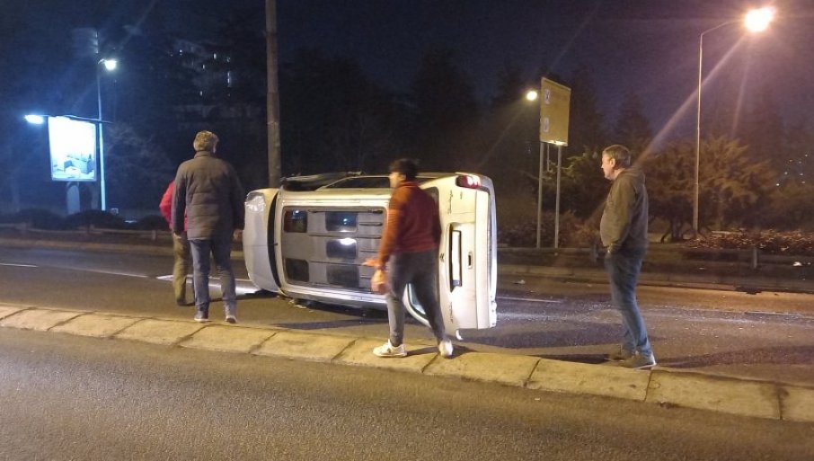 Iz za sada nepoznatih razloga automobil koji se kretao iz pravca BIP-a ka centru grada prevrnuo se na krov, a sa automobila koji se dimio otpao je prednji levi točak.