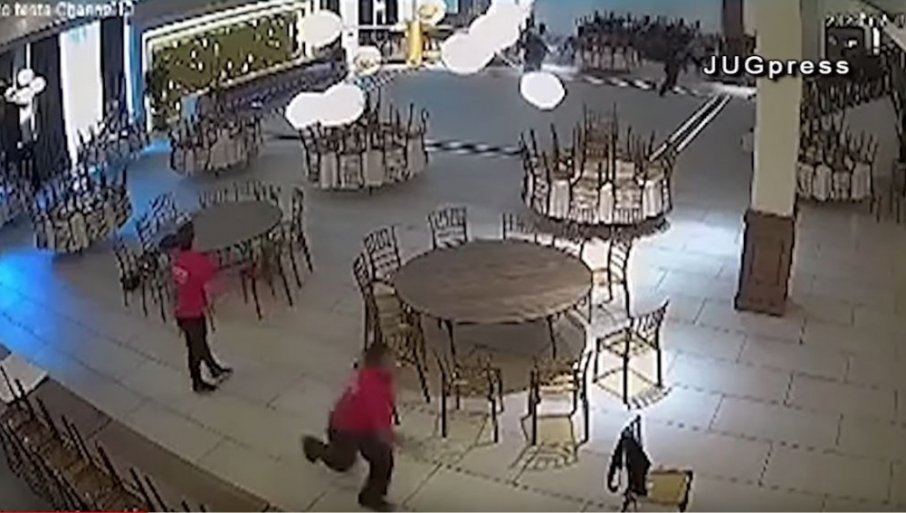Oni su pripremali prostor za najavljeno svadbeno veselje kada su začuli neobično krckanje sa tavanice koje se pojačavalo. Na snimku sigurnosnih kamera koje su zabeležile havariju, a koji kruži društvenim mrežama vidi sa trenutak kada počinju da padaju prve ploče sa spuštene tavanice i zaposleni raštrkani po sali koji posle trenutne zapanjenosti munjevito istrčavaju iz prostorije, što ih je spaslo od, u najboljem slučaju, teških povreda. Za samo nekoliko sekundi ploče povezane čeličnim šinama sa mnoštvom rasvetnih tela otkačile su se sa armiranobetonskih nosača i pale lomeći sve pod sobom.