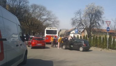 Desnom stranom autobusa "zakačio" je levi prednji branik gospođe koja je vozila putnički automobil i izletela ispred autobusa.