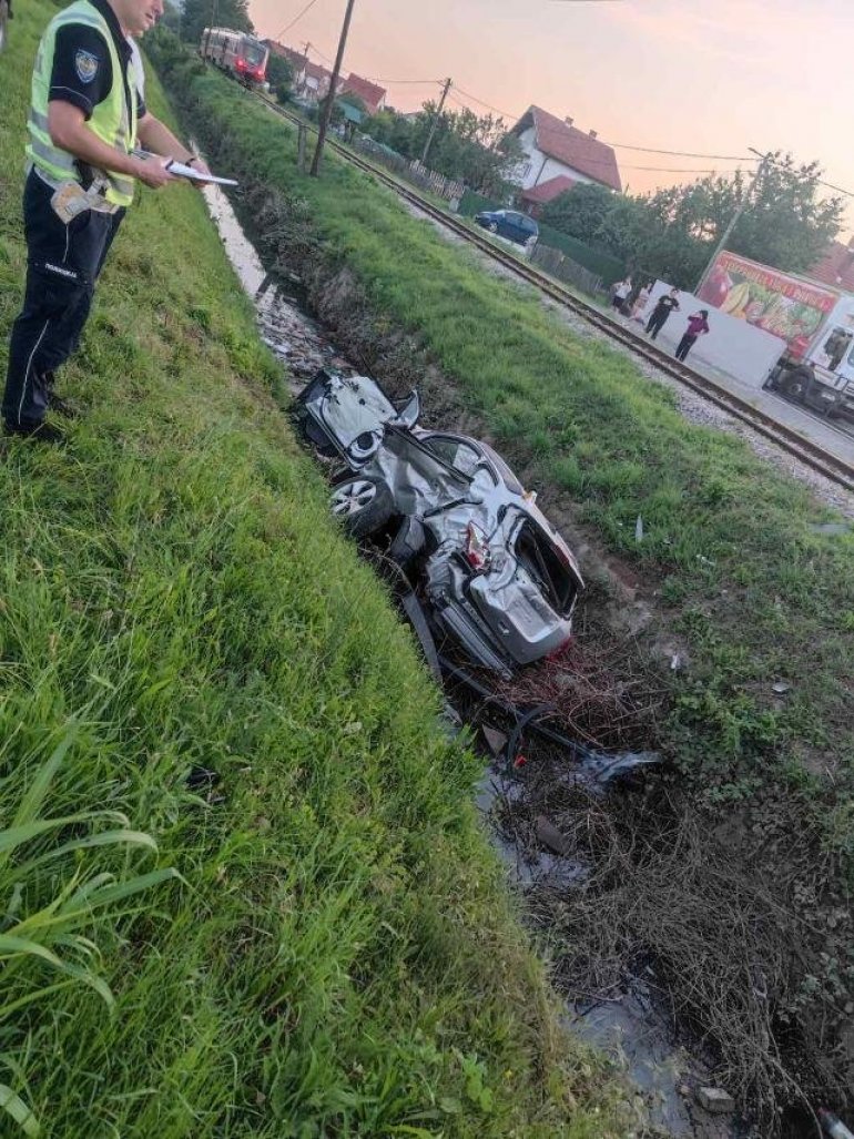 VECERAS nešto pre 20 časova putnički voz naleteo je na automobil marke "opel moka" i odbacio ga u kanal. Sve se desilo na neobezbeđenom pružnom prelazu na Lagatoru.