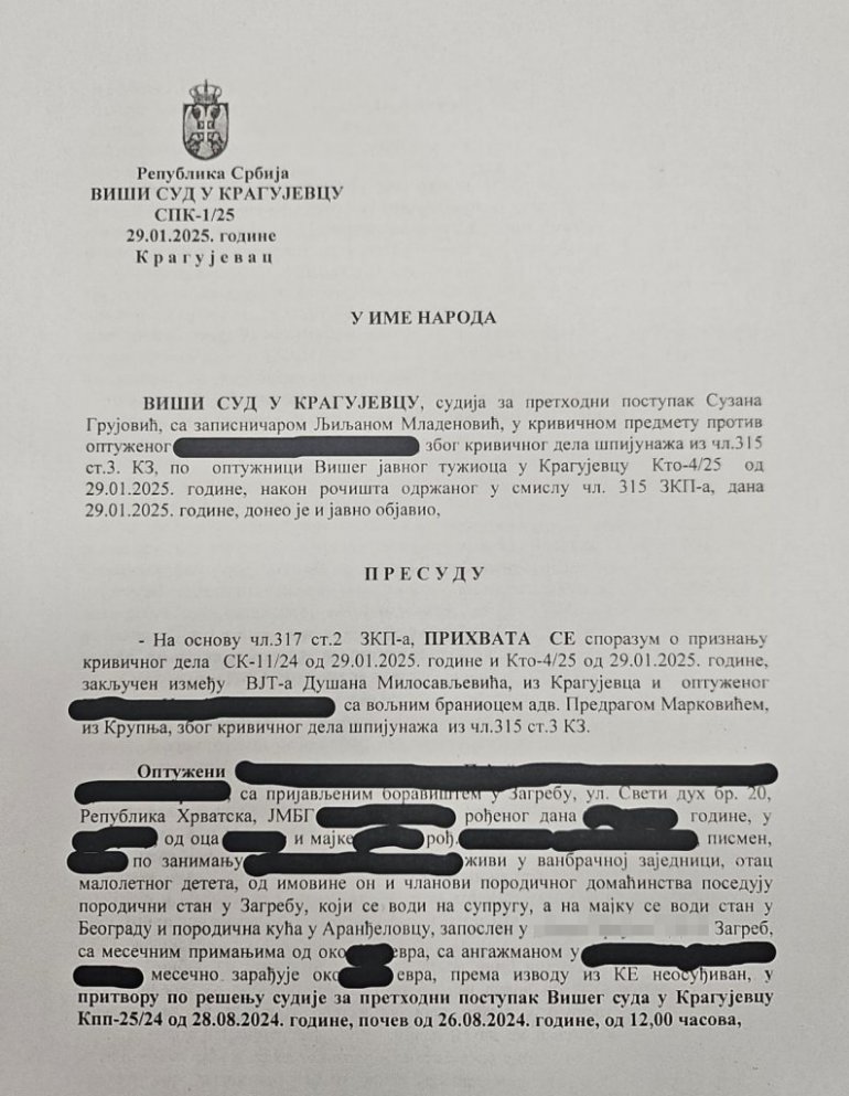 NAKON što se pred nadležnim Višim javnim tužilaštvom u Kragujevcu izjasnio krivim po svim tačkama optužnice i priznao da je u Srbiji bio angažovan kao špijun za hrvatsku Sigurnosno – obaveštajnu agenciju (SOA), P. Dž. je krajem januara ove godine od strane Višeg suda u Kragujevcu za krivično delo špijunaže u korist Hrvatske pravosnažno osuđen na zatvorsku kaznu, sa čijim je izdržavanjem već otpočeo.
