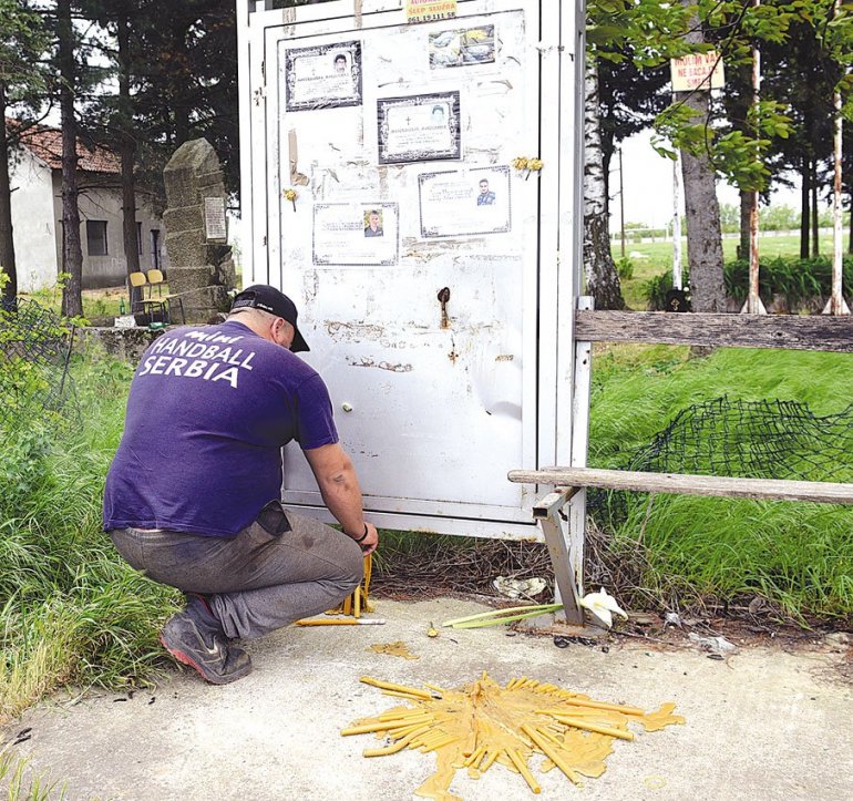 Nesreća je gotovo opipljiva na ulazu u selo. Jauci nesrećnih roditelja Zorice i Saše Panić, kojima je ubijeno oboje dece, Milan i Kristina, udaraju u samo nebo. Okupili su rodbinu i izašli na groblje. Dva bela krsta izranjaju iz nepreglednih "belih" bašta okruženi ljudskom crninom. Grobovi su, pored puta, na uzvišici, kao svetionici. Foto N. Skenderija