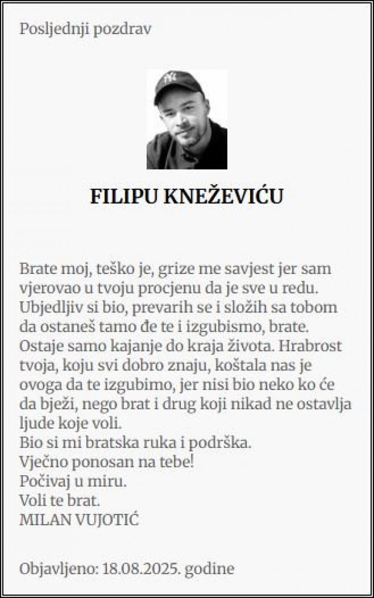 - Brate moj, teško je, grize me savjest jer sam vjerovao u tvoju procjenu da je sve u redu. Ubjedljiv si bio, prevarih se i složih sa tobom da ostaneš tamo đe te i izgubismo, brate. Ostaje samo kajanje do kraja života. Hrabrost tvoja, koju svi dobro znaju, koštala nas je ovoga da te izgubimo, jer nisi bio neko ko će da bježi, nego brat i drug koji nikad ne ostavlja ljude koje voli. Bio si mi bratska ruka i podrška. Vječno ponosan na tebe! Počivaj u miru. Voli te brat - napisao je Milan Vujotić, za koga smatraju da je desna Zvicerova ruka.