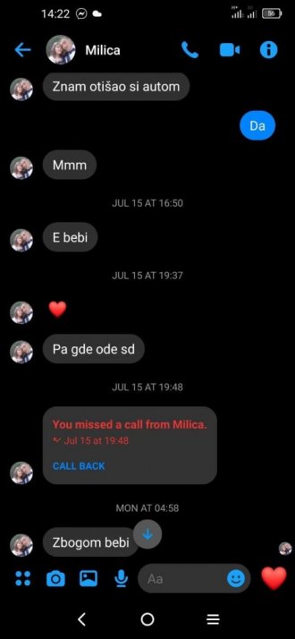 Milica je svom suprugu jutro kada je nestala, u 04,58 poslala poruku na Fejsbuku samo sa dve reči - „Zbogom bebi“ .