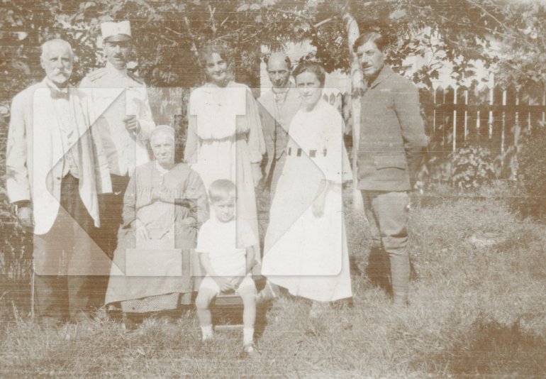 FAMILIJA Zora (desno) sa mužem Živanom, sinom i Živanovom porodicom u bašti kuće u Drajzerovoj, 1918, Foto Iz porodične arhive Aleksandra Krstića