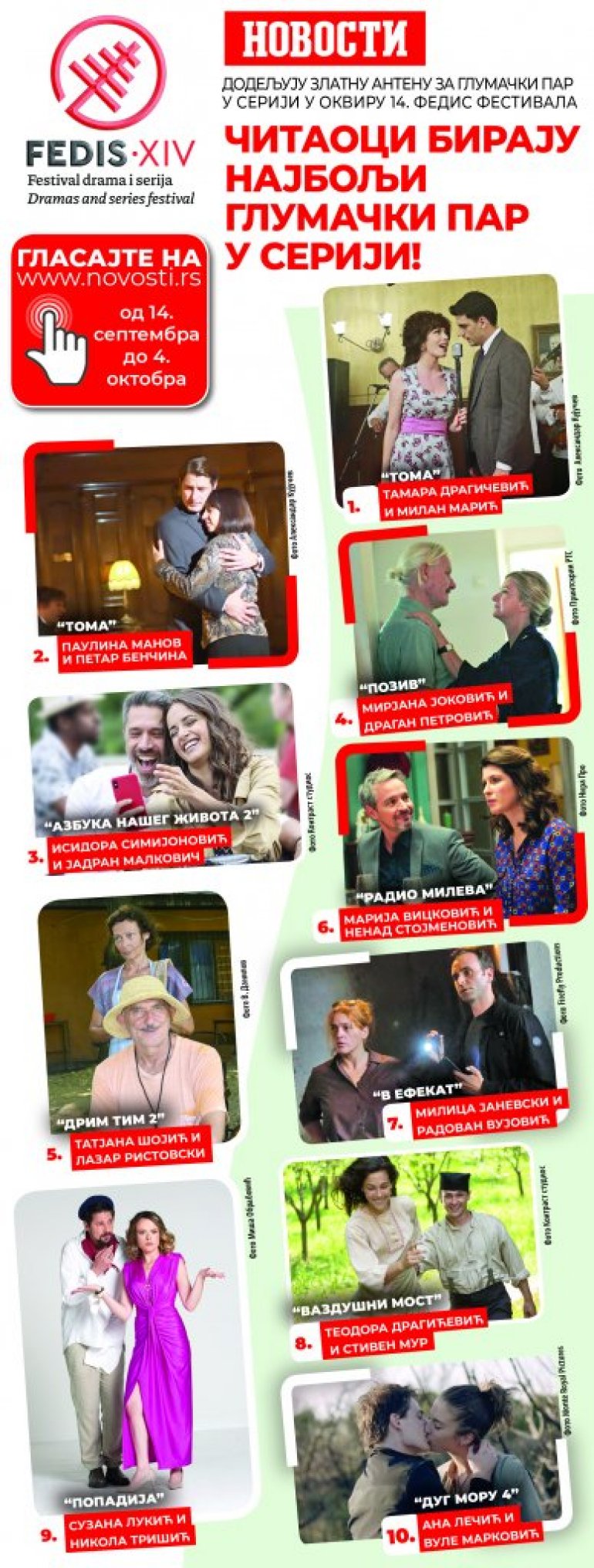 ZA nagradu "Zlatna antena za glumački par u seriji" koju, u okviru 14. FEDIS festivala, dodeljuju "Novosti", čitaoci mogu glasati od 14. septembra do 4. oktobra na našem portalu.