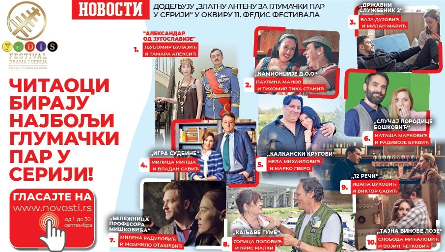 NOVOSTI dodeljuju „Zlatnu antenu za glumački par u seriji“ u okviru 11. FEDIS festivala, a vi ćete glasanjem u ovoj anketi odabrati najbolji glumački par u seriji.