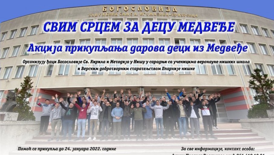ĐACI Bogoslovije "Svetih Kirila i Metodija" u Nišu, u saradnji sa učenicima veronauke niških škola i Verskim dobrotvornim starateljstvom Eparhije niške - organizuju akciju prikupljanja pomoći deci iz Medveđe.