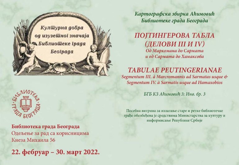 FOND retke i stare knjige Bibliteke Grada Beograda predstaviće od sledeće nedelje do kraja marta dragulj iz svoje riznice - otisak Pojtingerove table iz 1652. godine, najčuvenije stare putne mape sveta.