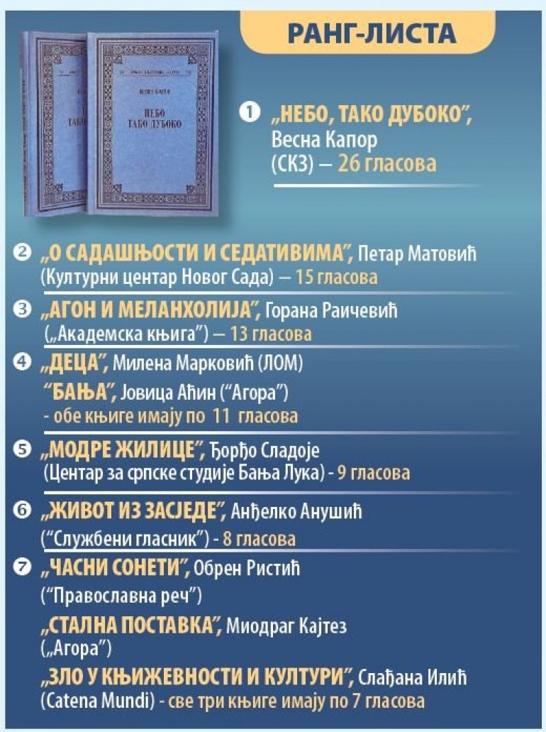 GLASOVE za roman "Nebo, tako duboko" dali su: Jovan Pejčić, Danica Andrejević, Saša Radojčić, Duško Babić, Vladimir Perić, Jasmina Tonić, Radivoje Mikić, Sanja Macura, Dušica Potić, Nebojša Lazić, Slađana Jaćimović, Sunčica Denić, Časlav Nikolić, Milica Kecojević, Petar Pijanović, Nikola Marinković, Mićo Cvijetić, Marko Paovica, Svetlana Šeatović, Milan Todorov, Dobrivoje Stanojević, Aleksandar Dunđerin, Tatjana Lazarević Milošević, Mile Tasić, Ana Gvozdenović, Nemanja Veljović Subrosa.