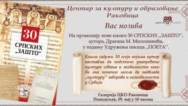 U GALERIJI Centra za kulturu Rakovica, u ponedeljak 9.maja,biće predstavljena knjiga "30 srpskih "zašto" autora Dragana Miloševića, u izdanju Udruženja pisaca "Poeta" iz Beograda.
