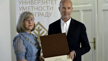 PUNA sala uglednih zvanica u Rektoratu na Kosančićevom vencu, pozdravila je dugim i srdačnim aplauzom novog počasnog doktora Univerziteta umetnosti u Beogradu, austrijskog umetnika svetskog glasa Ervina Vurma, čija se velika izložba trenutno odvija na svih pet nivoa MSU.