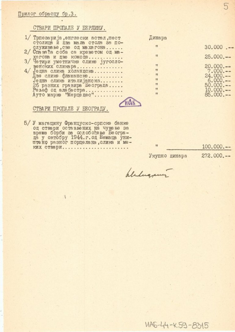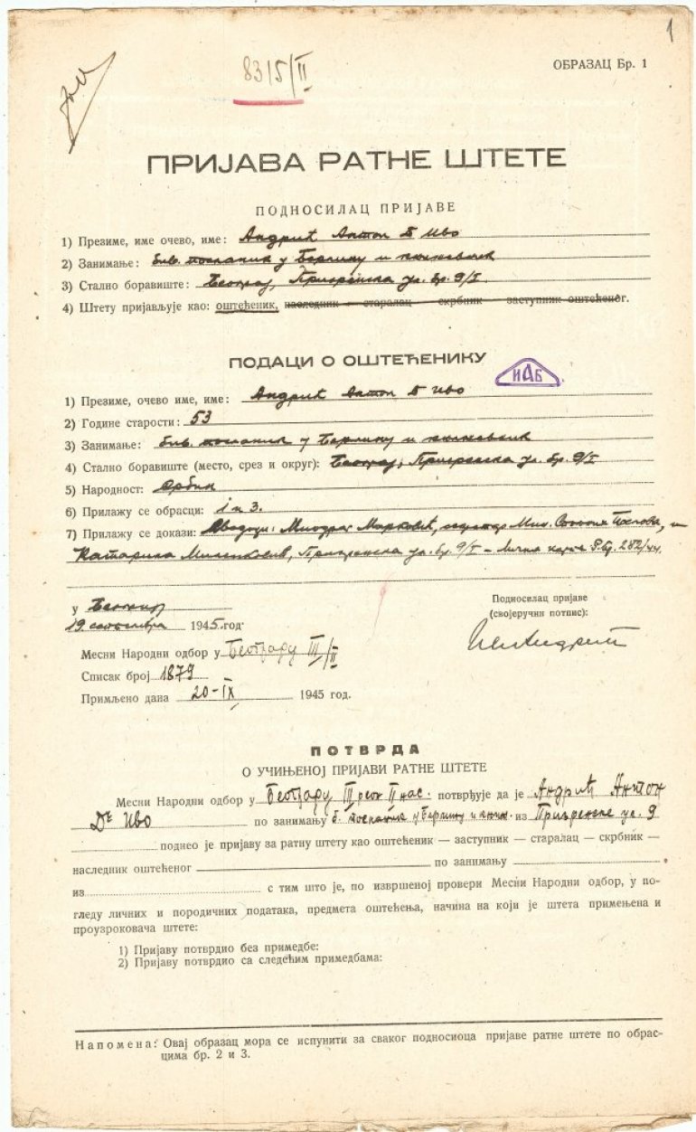 - Kao što sam davno, na stranicama "Novosti", objavila dva nepoznata Andrićeva dokumenta - ličnu kartu i vojnu knjižicu iz 1952. godine u kojima se on deklariše kao Srbin, tako sam i sada pronašla Prijavu ratne štete od 19. septembra 1945. godine gde je Andrić upisao da je Srbin. Interesantan je Andrićev spisak stvari propalih u Berlinu i Beogradu za vreme rata. Andrić je, očevidno, kupio u Berlinu lep nameštaj od mahagonija, posedovao je veći broj umetničkih slika jugoslovenskih i evropskih autora, kao i automobil marke "mercedes benc kabriolet A", sa dvoja vrata, u vrednosti od 85.000 nemačkih maraka, što se smatralo dobrim automobilom srednje klase.