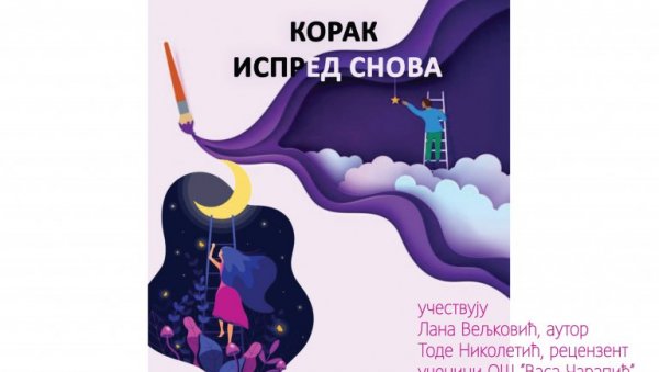 ZBIRKA pesama „Korak ispred snova“, talentovane mlade autorke, Lane Veljković, biće predstavljena 19.oktobra u 18 časova, na prociji koju zajedničkki organizuju Ustanova kulture „Beli Potok“ i OŠ „Vasa Čarapić“, u amfiteatru škole ( Avalska 48).