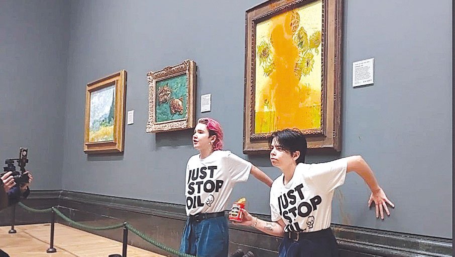 Mnogi će se zapitati kakve veze imaju slikari sa borbom protiv korišćenja fosilnih goriva, imajući u vidu da britanski pokret "Samo zaustavite ulje" vodi borbu protiv novih projekata vađenja nafte i gasa. Njihovi članovi su odlučili da organizuju hepeninge ispred poznatih umetničkih dela očigledno da bi privukli veću pažnju, a simbolična veza je nedavno pronađena i ispred čuvene Van Gogove slike "Suncokreti" u Nacionalnoj galeriji u Londonu koju su dvoje članova istog pokreta polili sosom od paradajza.