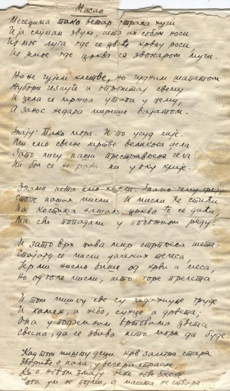 - Neobično, kao da ste tu, sa pesnikom. Reč je o parčetu hartije koje je bilo u rukama Milutina Bojića. Dodir s njim nešto je sasvim posebno. Rukopis je, sam po sebi, jedinstven. Nema kopije. Hartija je oštećena, možda je nastala i u borbi, u vreme kada su prelazili Albaniju. Inače, ove dve pesme su otkupljene posle Drugog svetskog rata i nalaze se u zbirci rukopisa Biblioteke grada Beograda. Nažalost, koleginica nije zapisala od koga je otkupila, ali je, svakako, bila velika suma za to vreme - dve hiljade dinara.