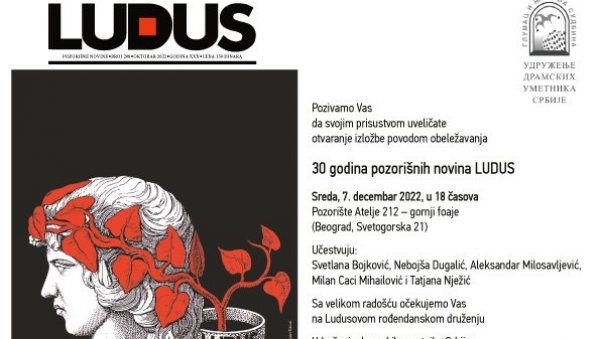 UDRUŽENjE dramskih umetnika Srbije organizuje u sredu, 7.decembra, svečanost u Ateljeu 212 povodom obeležavanja 30 godina od objavljivanja prvog broja Pozorišnih novina "Ludus".