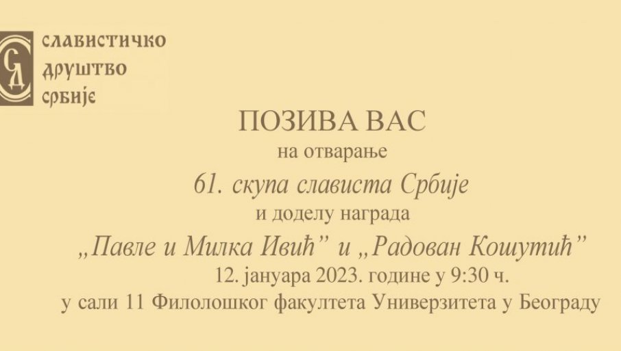 U ORGANIZACIJI Slavističkog društva Srbije 12. i 13. januara na Filološkom fakultetu u Beogradu biće održan 61. skup slavista Srbije, sa naučnim simpozijumom na temu "Slavistička istraživanja - između filologije i kulturologije".