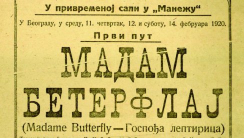 OPERA "Madam Baterflaj" Đakoma Pučinija, bila je prva operska predstava koja je izvedena 11. februara 1920. godine, pod dirgentskom upravom Stanislava Biničkog na sceni Narodnog pozorišta u Beogradu: u subotu (11.februara) ovim povodom pripremljen je specijalni rođendanski program.