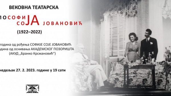 POVODOM sto godina od rođenja i dve decenije od smrti Sofije Soje Jovanović (1922 - 2002) prva srpske pozorišne i filmske rediteljke u Muzeju pozorišne umetnosti Srbije, u ponedeljak 27.februara, održaće se veče sećanja pod nazivom "Vekovna teatarska filosofija - Soja Jovanović i Akademsko pozorište".