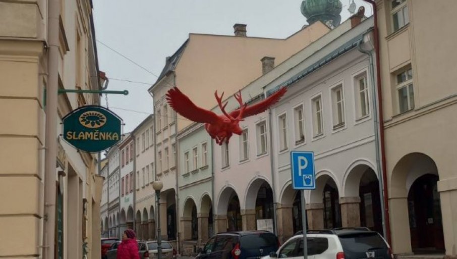 Na ulici, preko puta Gradske galerije, jedan crveni jelen nadleće glave pešaka. To je skulptura Mihaka Gabrijela, profesora Akademije primenjenih umetnosti iz Praga, koja je, takođe deo ove nesvakidašnje postavke.