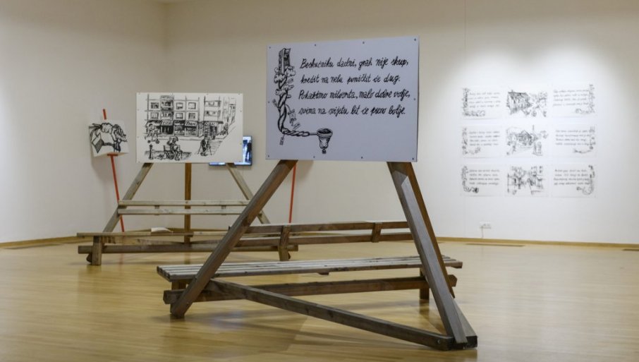 - Na svakodnevnom nivou susrećemo se sa posledicama neoliberalizma, a iako su okolnosti izmenjene od pre 90 godina, jednako je bremenit istorijski trenutak - smatra Karić, i dodaje da je svako od savremenih autora na to reagovao. - Tako je crtačku instalaciju sa, između ostalog i prizorima vezanim sa početak pandemije, Siniša Ilić inkorporirao u Detonijeve "Cvetove mašte", koji su metafora za užase rata. Udruženje "Kurs", nadovezujući se na linoreze Postružnika i novelu "Vesti iz nigdine" Vilijama Morisa, otvara temu preteće militarizacije društva. Vladan Jeremić i Rena Redle predstavili su intervencije u javnim prostorima, koje su radili u Zagrebu, Tirani i Norveškoj, pa je deo postavke i objekat korišćen na protestima protiv rušenja nacionalnog pozorišta u Albaniji.