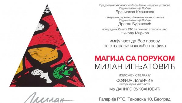 ZBOG predstojećih dana žalosti u Srbiji, otvaranje izložbe grafika "Magija sa porukom" slikara, nastavnika umetnosti i kompozitora Milana Ignjatovića zakazano za petak, 5. maj u 19 časova u Galeriji RTS, prebačeno je za sredu 10.maj, u 19 časova, na istom mestu.