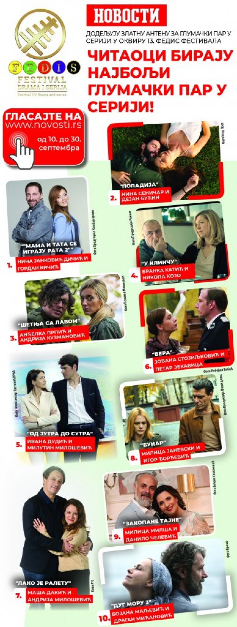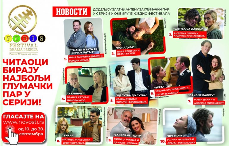 ZA nagradu "Zlatna antena za glumački par u seriji" koju, u okviru 13. FEDIS festivala, dodeljuju "Večernje novosti", čitaoci mogu glasati do 30. septembra na našem portalu.