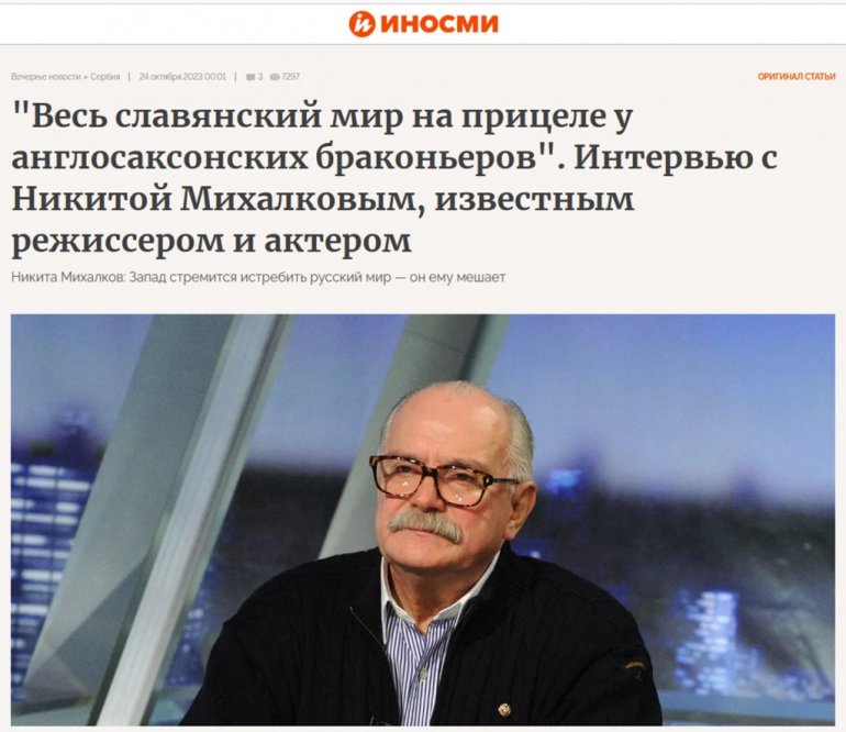 INTERVJU sa velikanom filmske umetnosti Nikitom Mihalkovom, pod nazivom "Ceo ruski svet je na nišanu anglosaksonskih lovokradica" (objavljen u svečanom broju "Večernjih novosti", povodom sedam decenija postojanja lista) - preneo je u celini veoma čitani ruski portal "Inosmi".