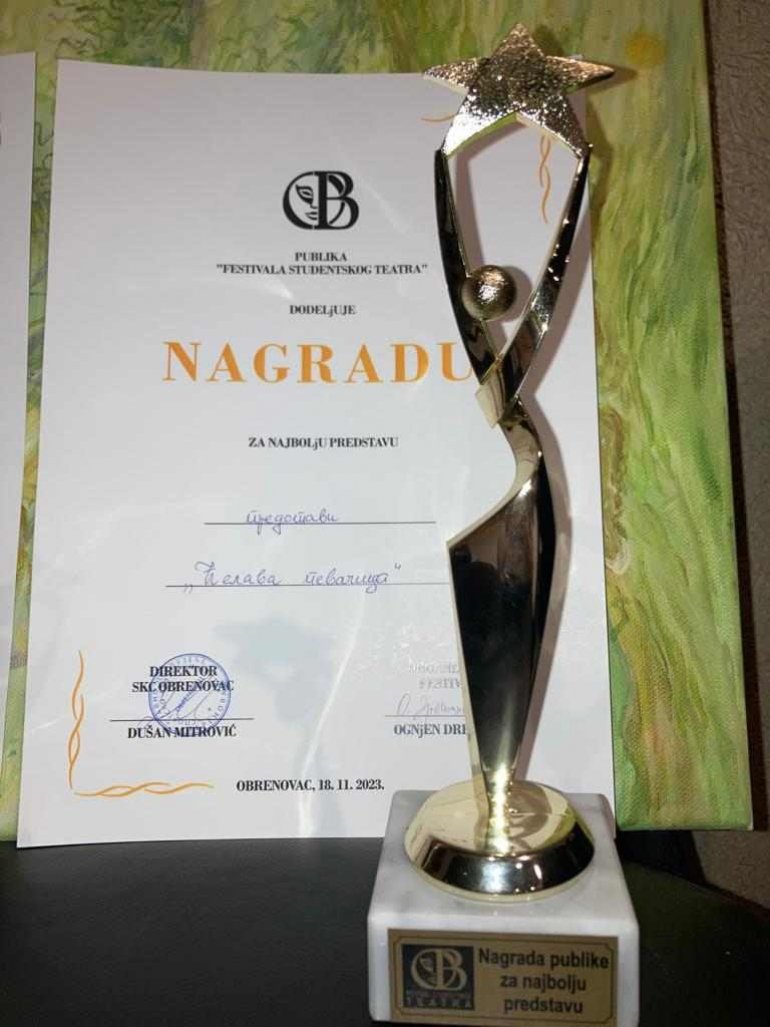 NAGRADA ZA GLAVNU ŽENSKU ULOGU - Andrijana Dragnić, za ulogu u predstavi "Prst"- Fakultet savremenih umetnosti Beograd