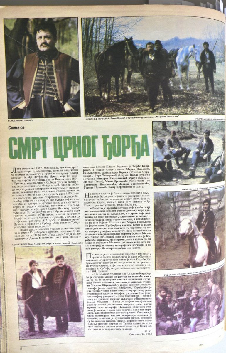 Ovako lepo sročenim uvodom započinje priča o srmti Karađorđa i okolnostima koje su dovele do nje u TV filmu "Gospodari" koji se, po scenariju Danka Popovića, ovih dana snima u okolini Velike Plane. Reditelj je Đorđe Kadijević, a glavne uloge tumače Marko Nikolić (Karađorđe), Aleksandar Berček (Miloš Obrenović), Bora Todorović (Naum), Pavle Vujisić (Vujica), Miodrag Radovanović Mrgud (Marašli Ali Paša), Miki Krstović (Melentije) - uz Svetozara Cvetkovića, Jovana Janićijevića, Goricu Popović, Tomu Kuruzovića i druge.