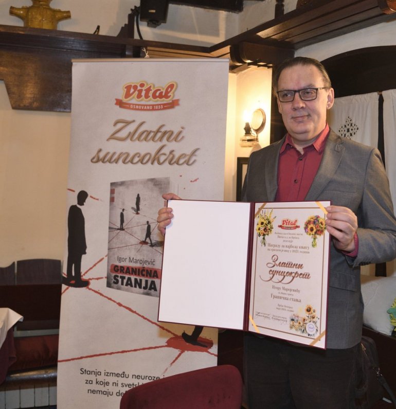 UGLEDNA nagrada "Zlatni suncokret", koju dodeljuje kompanija "Vital", juče je na svečanosti u skadarlijskoj kafani "Tri šešira" uručena Igoru Marojeviću (1968) za zbirku priča "Granična stanja", u izdanju "Derete".