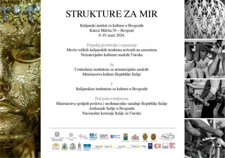 U petak, 8. marta u 18.00 časova u Italijanskom institutu za kulturu u Beogradu održaće se izložba-instalacija "Machines for Peace - Strukture za mir", koju realizuje umetnička organizacija Mreža proslava velikih italijanskih struktura nošenih na ramenima.
