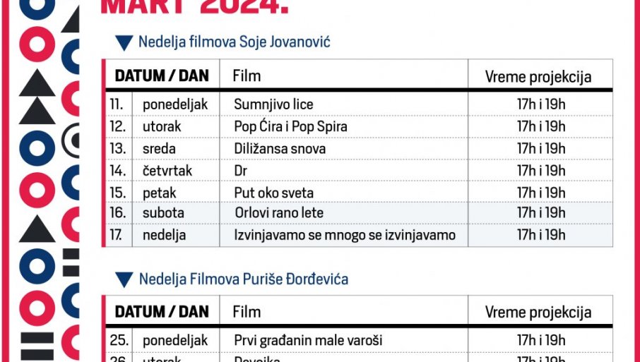FILMSKI centar Srbije će u Bioskopskoj sali FCS u MTS dvorani, od 11. do 17. marta predstaviti filmove čuvene rediteljke Soje Jovanović, kao što su "Izvinjavamo se, mnogo se izvinjavamo", "Sumnjivo lice", "Pop Ćira i pop Spira", "Orlovi rano lete", "Put oko sveta", dok će od 25. do 31. marta publika biti u prilici da gleda poznate naslove reditelja Puriše Đorđevića, poput filmova "Devojka", "San", "Jutro", "Podne".