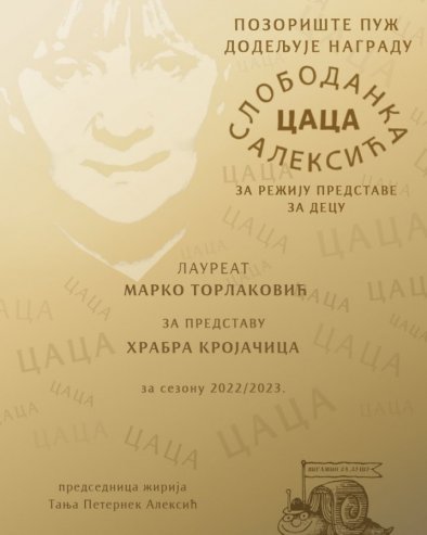 REDITELj Marko Torlaković četvrti je dobitnik Nagrade "Slobodanka Caca Aleksić" za najbolju režiju predstave za decu: priznanje mu je donela "Hrabra krijačica" Kruševačkog pozorišta,a uručenje je 31. maja u Pozorištu "Puž".